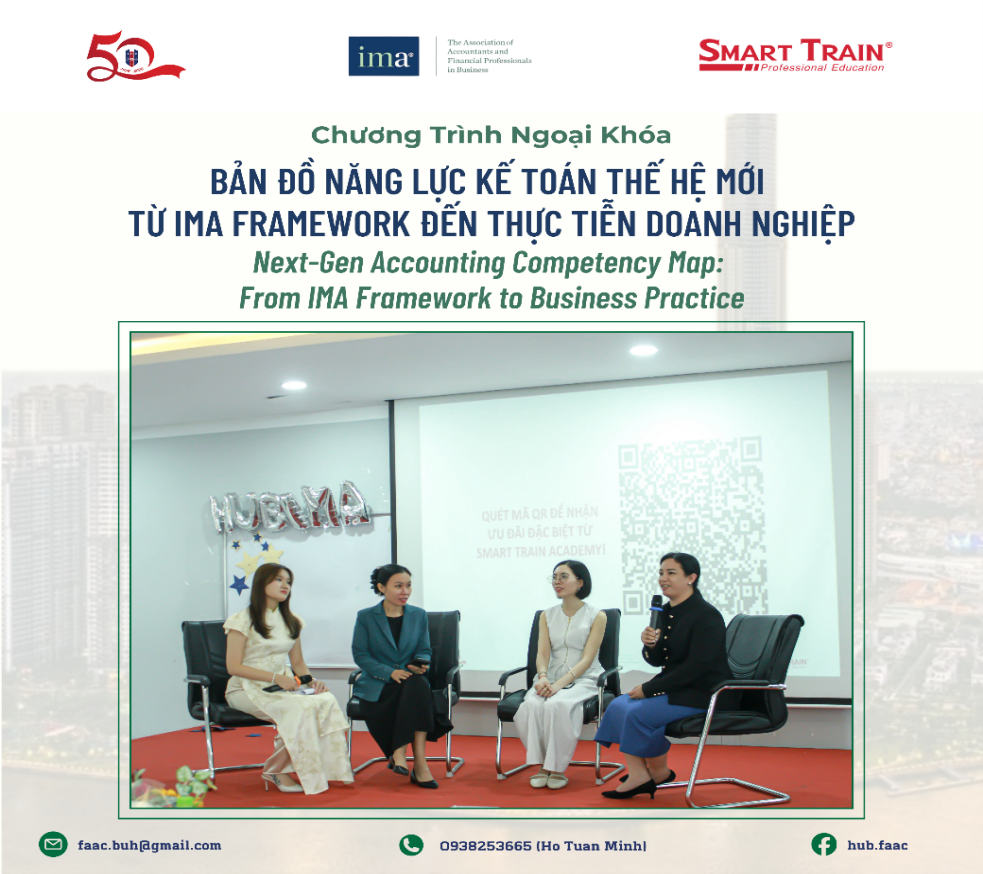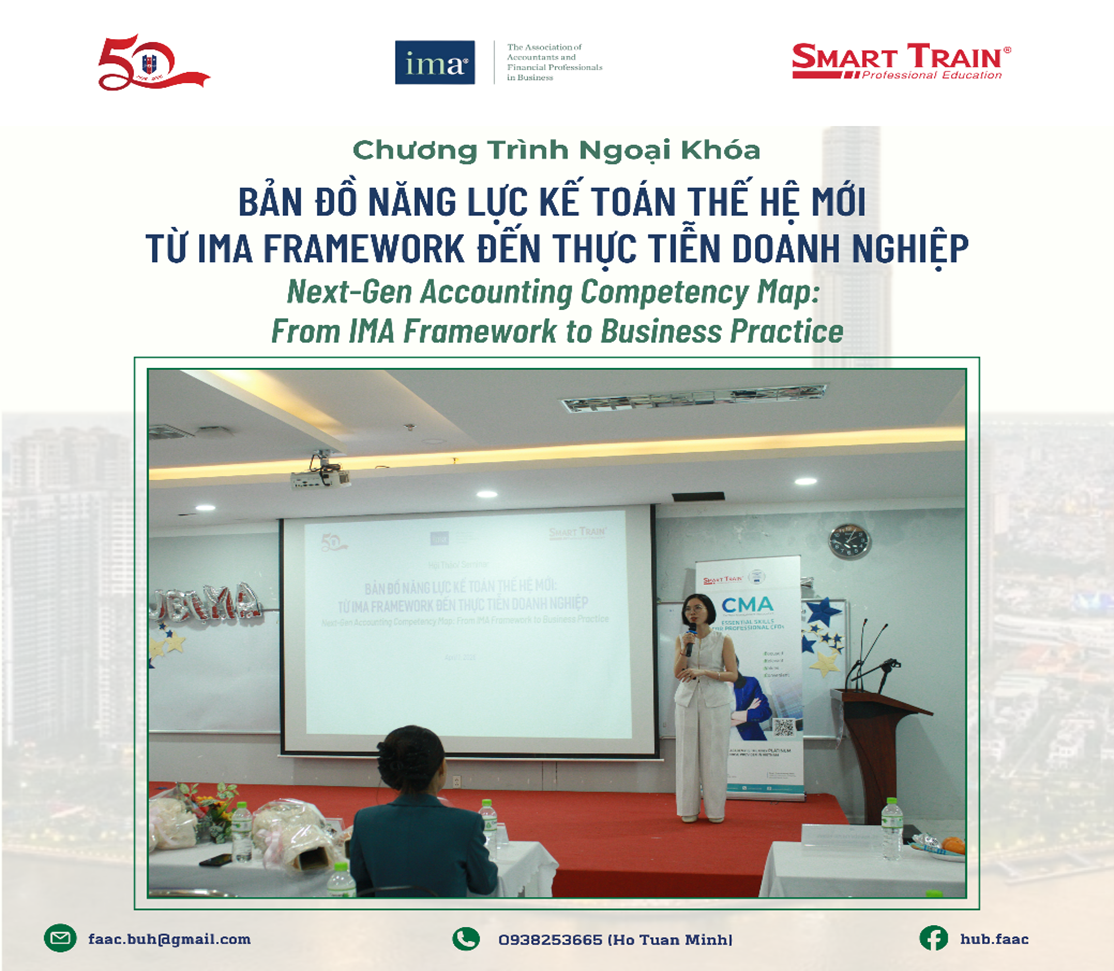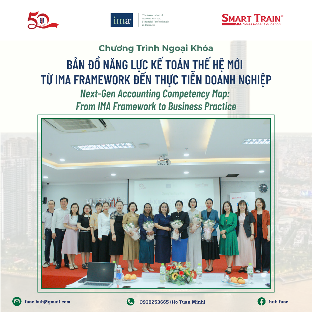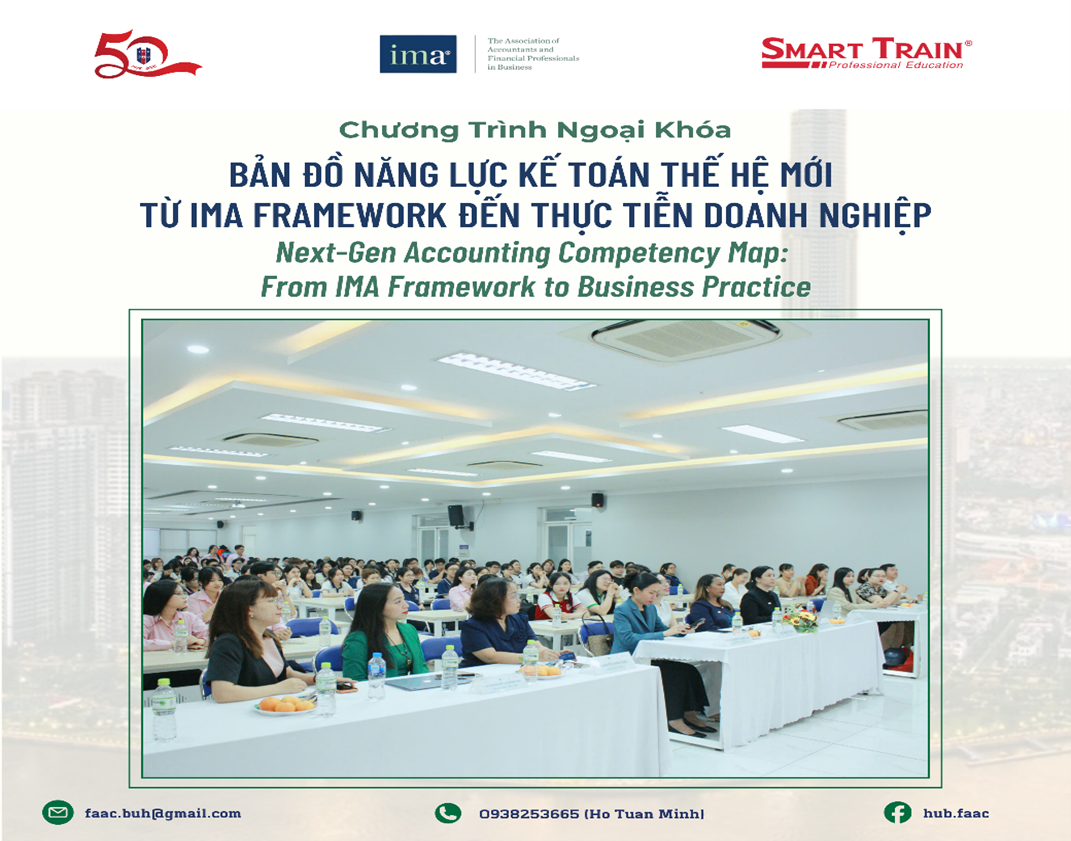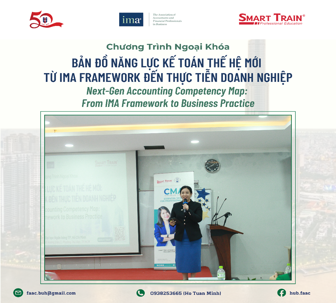 Trước sự bùng nổ của AI, Big Data và yêu cầu về phát triển bền vững (ESG), vai trò của người làm Kế toán - Quản trị Tài chính đang thay đổi nhanh chóng. Để tái định hình các kỹ năng cần thiết cho tương lai, Hiệp hội Kế toán Quản trị Hoa Kỳ (IMA) đã chính thức công bố khung năng lực mới, mở rộng “tấm bản đồ” sự nghiệp của các chuyên gia trong ngành từ năm 2025. Nằm trong chuỗi hoạt động học thuật nhằm tăng cường kết nối giữa đào tạo và thực tiễn nghề nghiệp, vào chiều ngày 01/04/2026, Khoa Kế toán – Kiểm toán & Khoa Tài chính của Trường Đại học Ngân hàng TP. Hồ Chí Minh đã phối hợp cùng Smart Train Academy và Hiệp hội Kế toán Quản trị Hoa Kỳ (IMA) tổ chức thành công buổi ngoại khóa chuyên môn với chủ đề “BẢN ĐỒ NĂNG LỰC KẾ TOÁN THẾ HỆ MỚI: TỪ IMA FRAMEWORK ĐẾN THỰC TIỄN DOANH NGHIỆP” tại Hội trường B2.10.01.