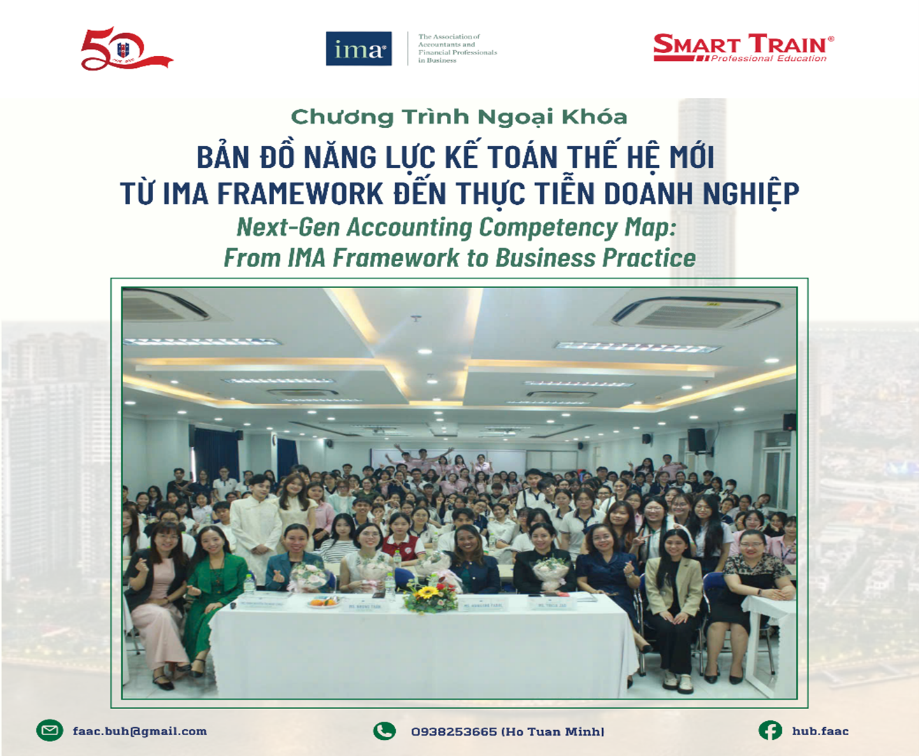Thông qua chương trình, sinh viên không chỉ được tiếp cận với khung năng lực Kế toán quản trị cập nhật năm 2026 mà còn hiểu rõ hơn về vai trò của công nghệ, đặc biệt là trí tuệ nhân tạo, trong lĩnh vực kế toán – tài chính. Ban tổ chức xin gửi lời cảm ơn chân thành Smart Train Academy và Hiệp hội Kế toán Quản trị Hoa Kỳ (IMA) đã đồng hành và mang đến những chia sẻ quý báu cho các bạn sinh viên.